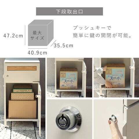下段収納は宅配ボックス。最大サイズは、幅40.9×奥行35.5×高さ47.2cm(120サイズ)で、大きな宅配物も配達可能です。