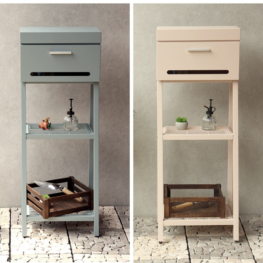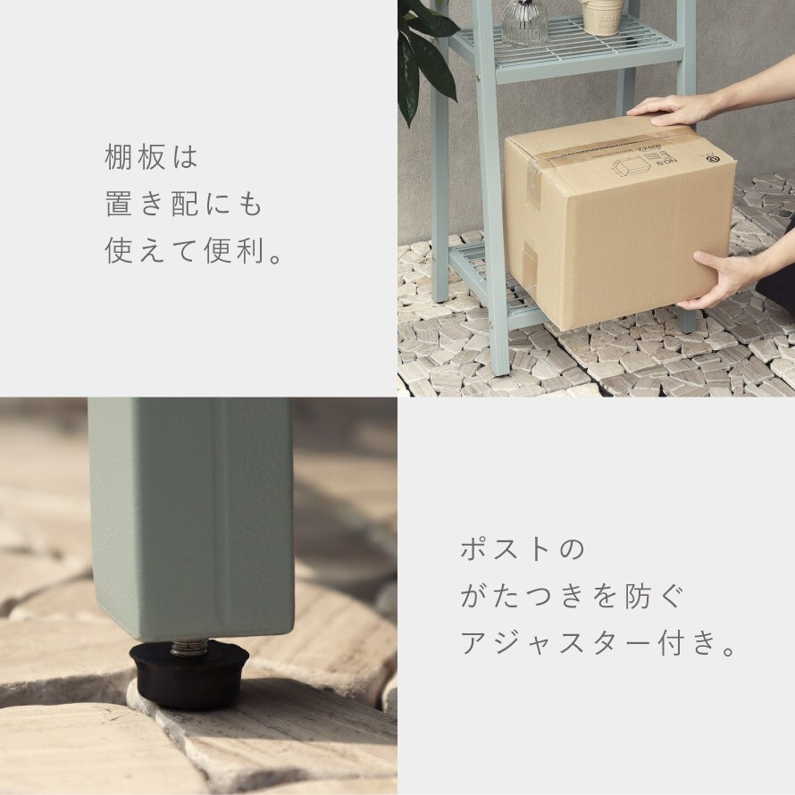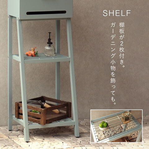 棚板付きタイプで、小さな荷物であれば、棚板を置き配用としてご使用いただけます。棚板は2枚あるので、小物の装飾やガーデニングアイテムの収納としても◎。