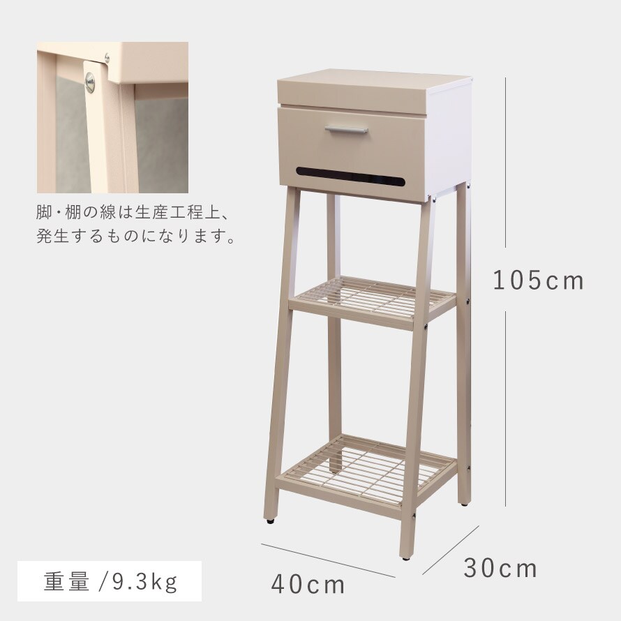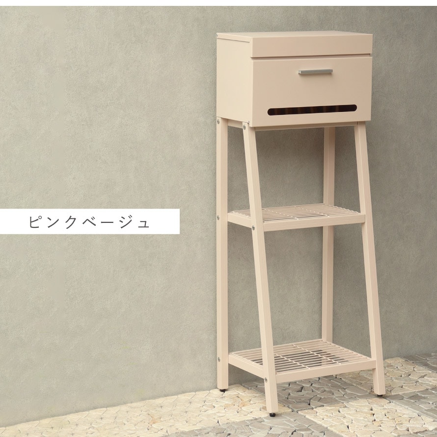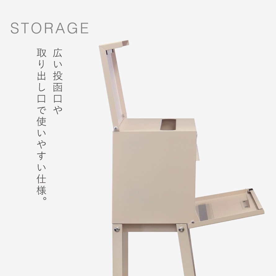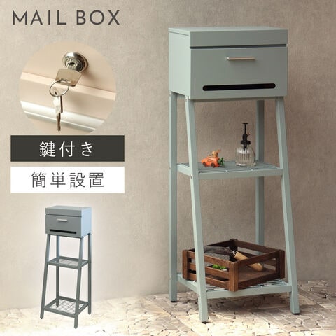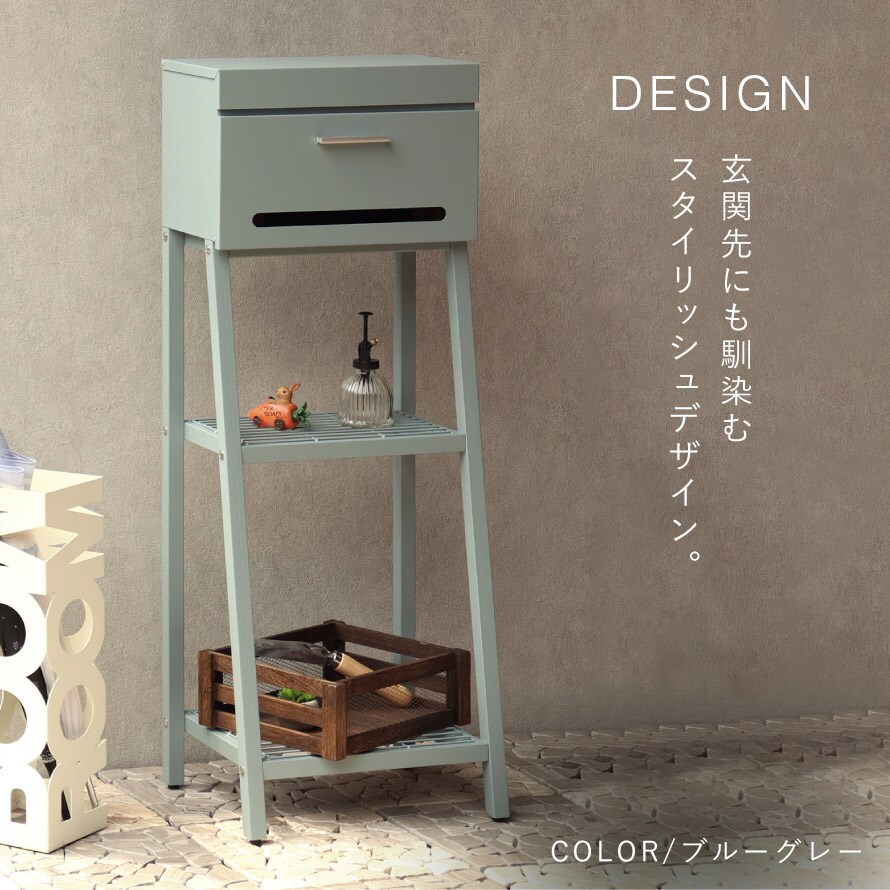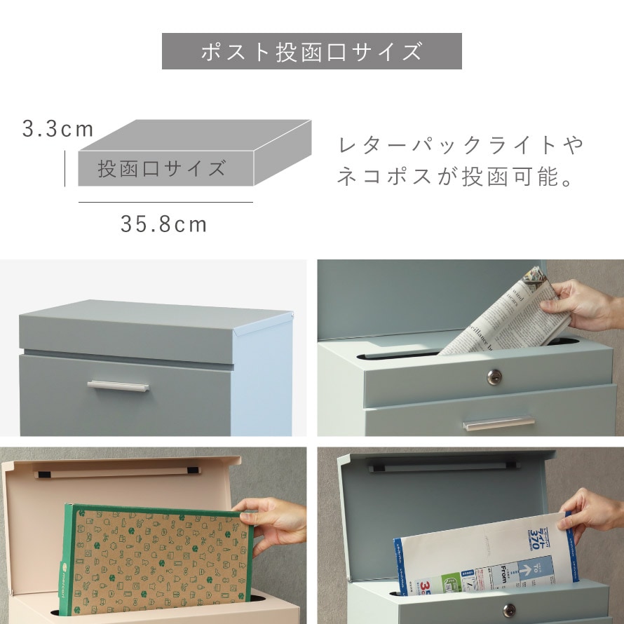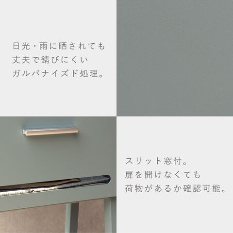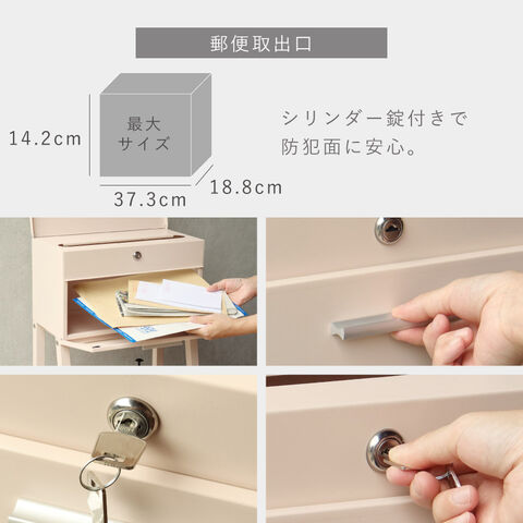 | サイズ | 本体/幅40.4×奥行30×高さ105cm、郵便入れ本体/幅40×奥行21.2×高さ25cm、棚板上段/幅34.6×奥行22.1cm、棚板下段/幅34.6×奥行28.4cm、投函口/幅35.8×高さ3.3cm、取出口/幅37.3×奥行18.8×高さ14.2cm |