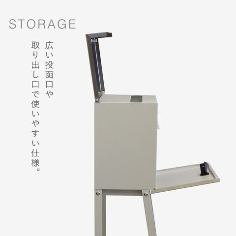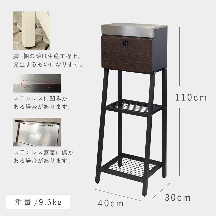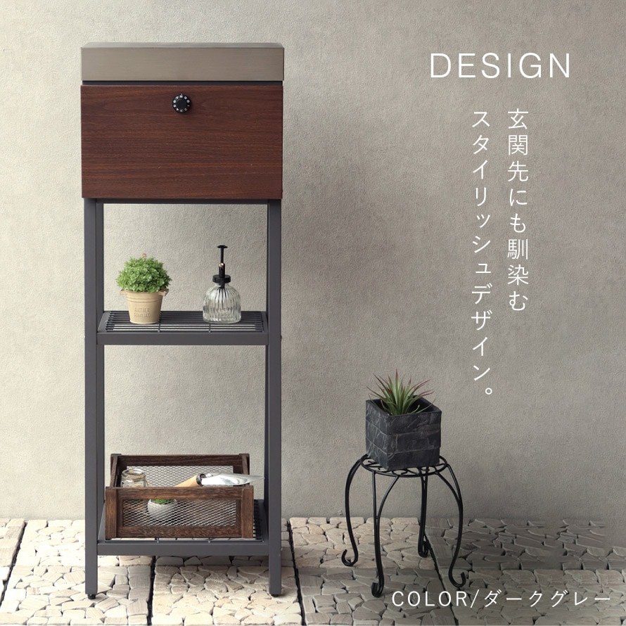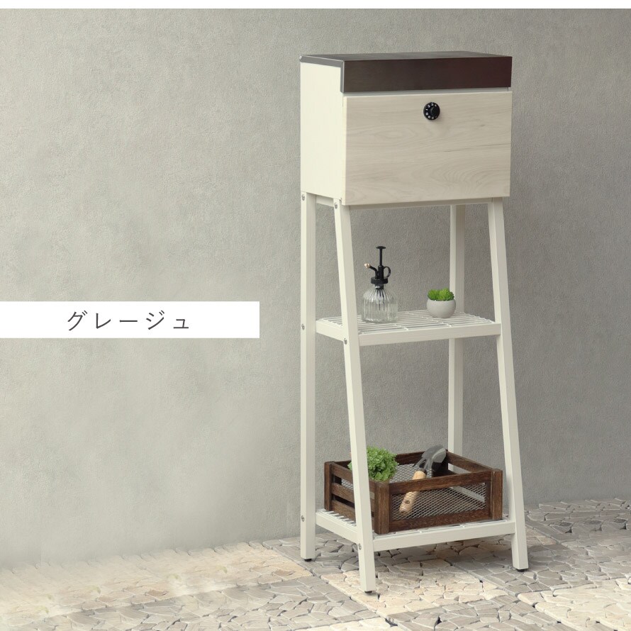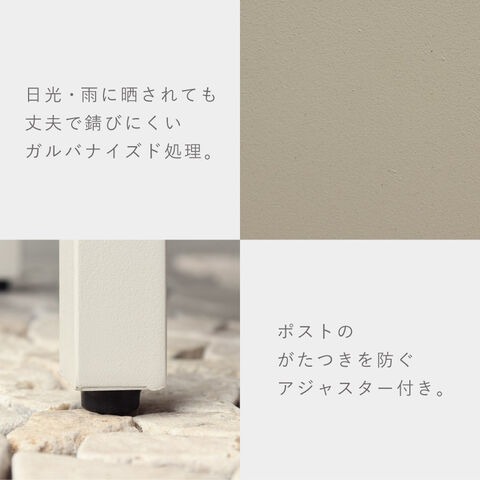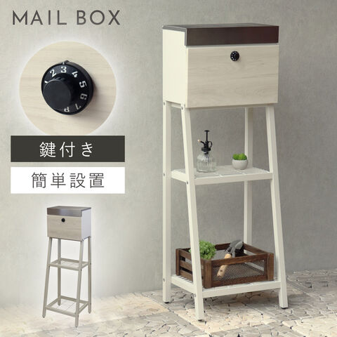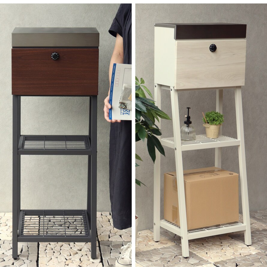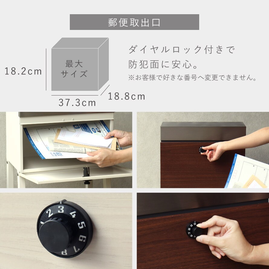 | サイズ | 本体/幅40×奥行30×高さ110cm、郵便入れ本体/幅40×奥行21.2×高さ29.7cm、棚板上段/幅34.6×奥行22.1cm、棚板下段/幅34.6×奥行28.4cm、投函口/幅35.8×高さ3.3cm、取出口/幅37.3×奥行18.8×高さ18.2cm |