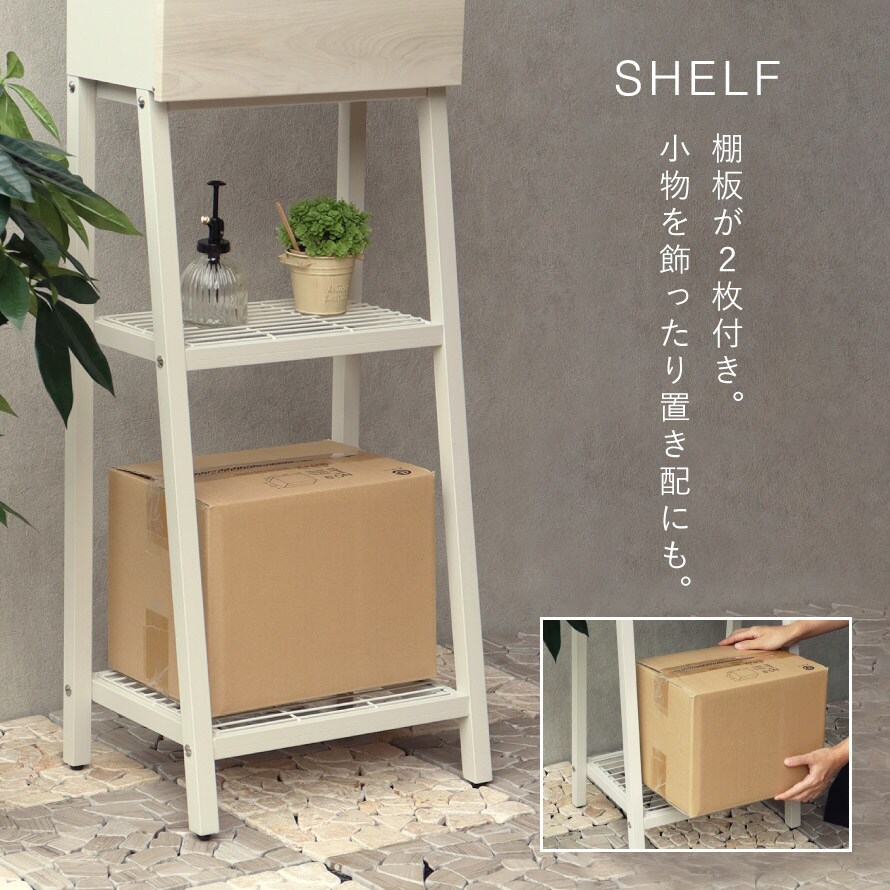 棚板付きタイプで、小さな荷物であれば、棚板を置き配用としてご使用いただけます。棚板は2枚あるので、小物の装飾やガーデニングアイテムの収納としても◎。