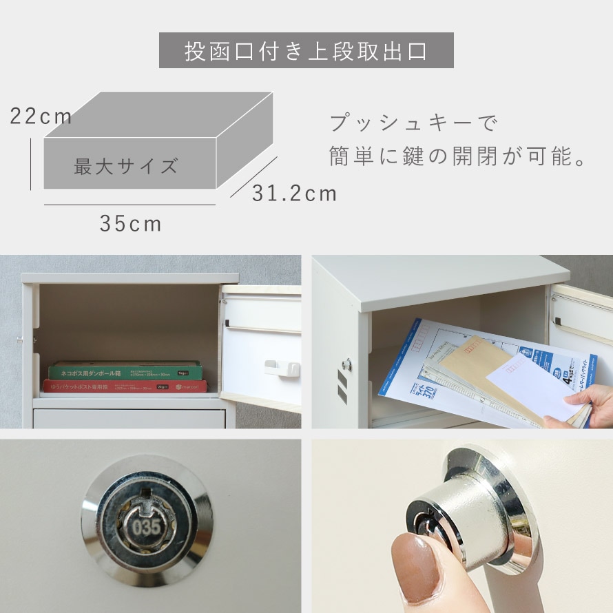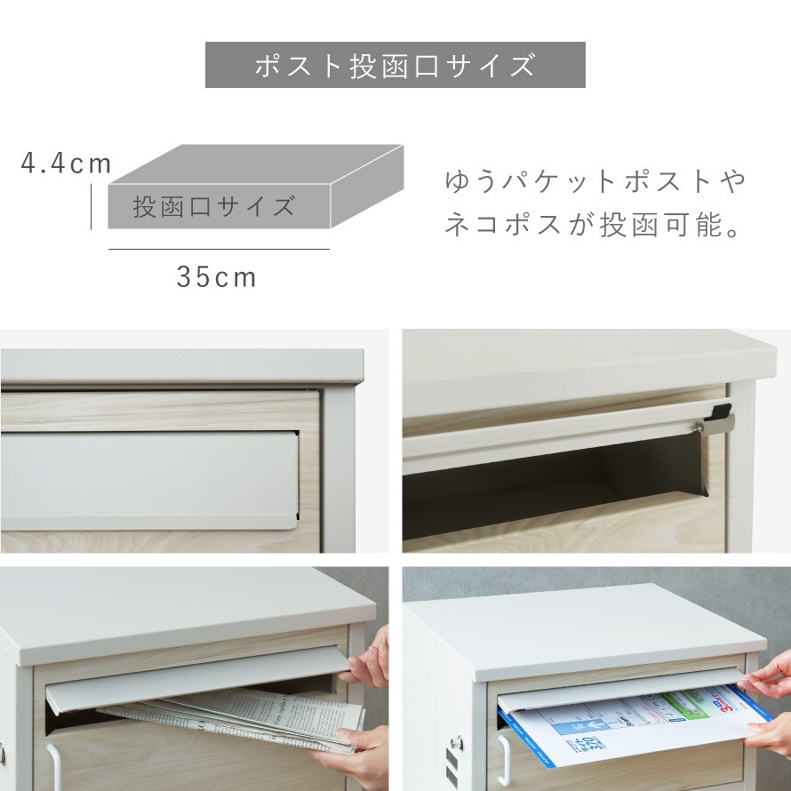 上段収納の投函口サイズは幅35×高さ4.4cmと大きなサイズ設計で、ゆうパケットポストやネコポスが投函可能です。