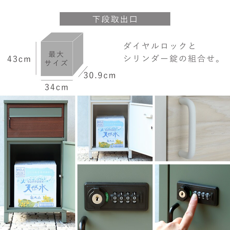 下段収納は宅配ボックス。最大サイズは、幅34×奥行30.9×高さ43cmで、大きな宅配物も配達可能です。