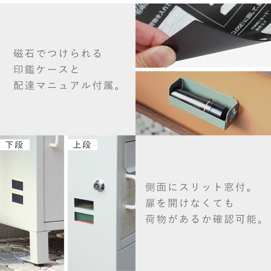 キーフック付き印鑑ケースと宅配業者用のマニュアルが付属しており(マグネット付きでお好きな場所に貼り付け可)、宅配ボックスとして、すぐにご使用いただけます。