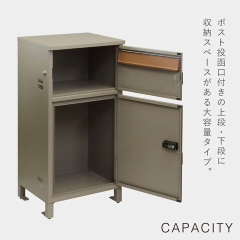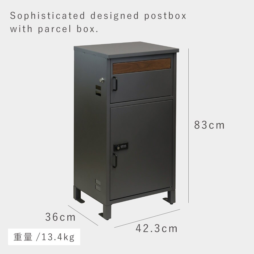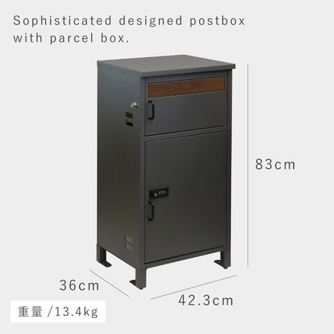 サイズ本体/幅42.3×奥行36(取手込みサイズ)×高さ83cm(アジャスター込みサイズ)、上段投函口/幅35×高さ4.2cm、上段取出口/幅35.5×奥行31.2×高さ22cm、下段取出口/幅34×奥行31.2×高さ43cm