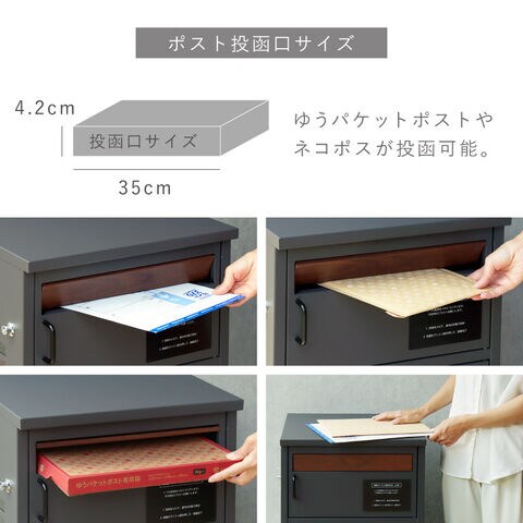 上段収納の投函口サイズは幅34×高さ4.2cmと大きなサイズ設計で、ゆうパケットポストやネコポスが投函可能です。