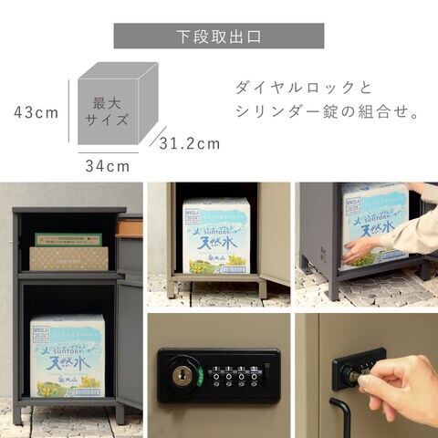下段収納は宅配ボックス。最大サイズは、幅34×奥行31.2×高さ43cmで、大きな宅配物も配達可能です。