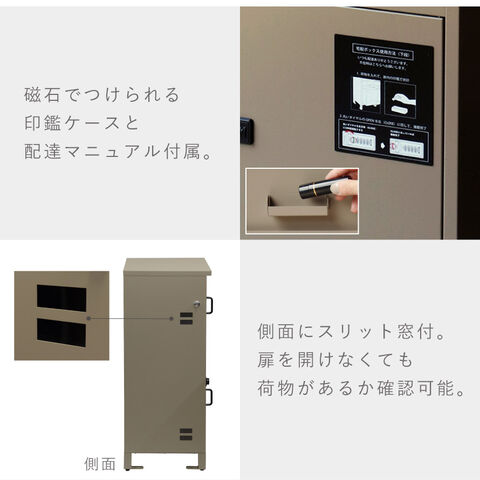 キーフック付き印鑑ケースと宅配業者用のマニュアルが付属しており(マグネット付きでお好きな場所に貼り付け可)、宅配ボックスとして、すぐにご使用いただけます。