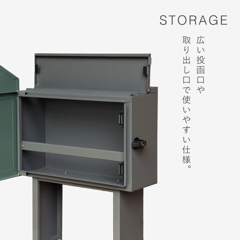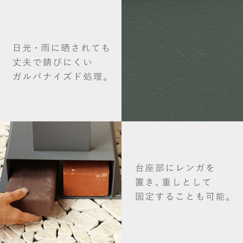 壁掛けポストのような施工をしなくても、置くだけで使用可能なスタンド式。台座の中に標準サイズのレンガを3個入れて重しとして使用可能です。また、地面に固定用のアンカーボルトも付属していますので、地面とポストをしっかりと固定することも可能です。
