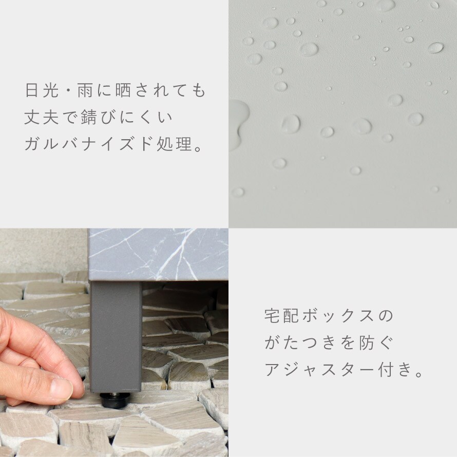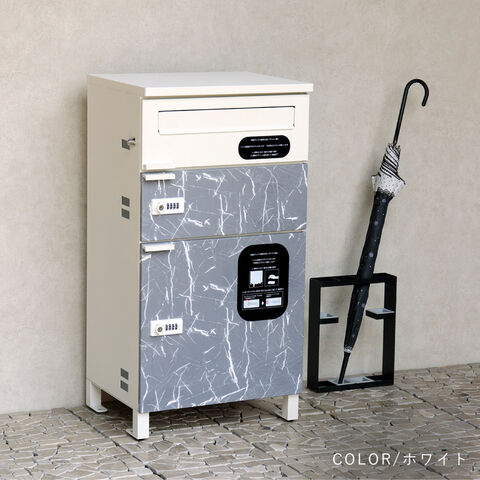 シンプルながらも存在感があり、玄関先を上品にするデザイン。宅配上段と宅配下段扉には大理石風シートを使用した特徴的なデザイン。