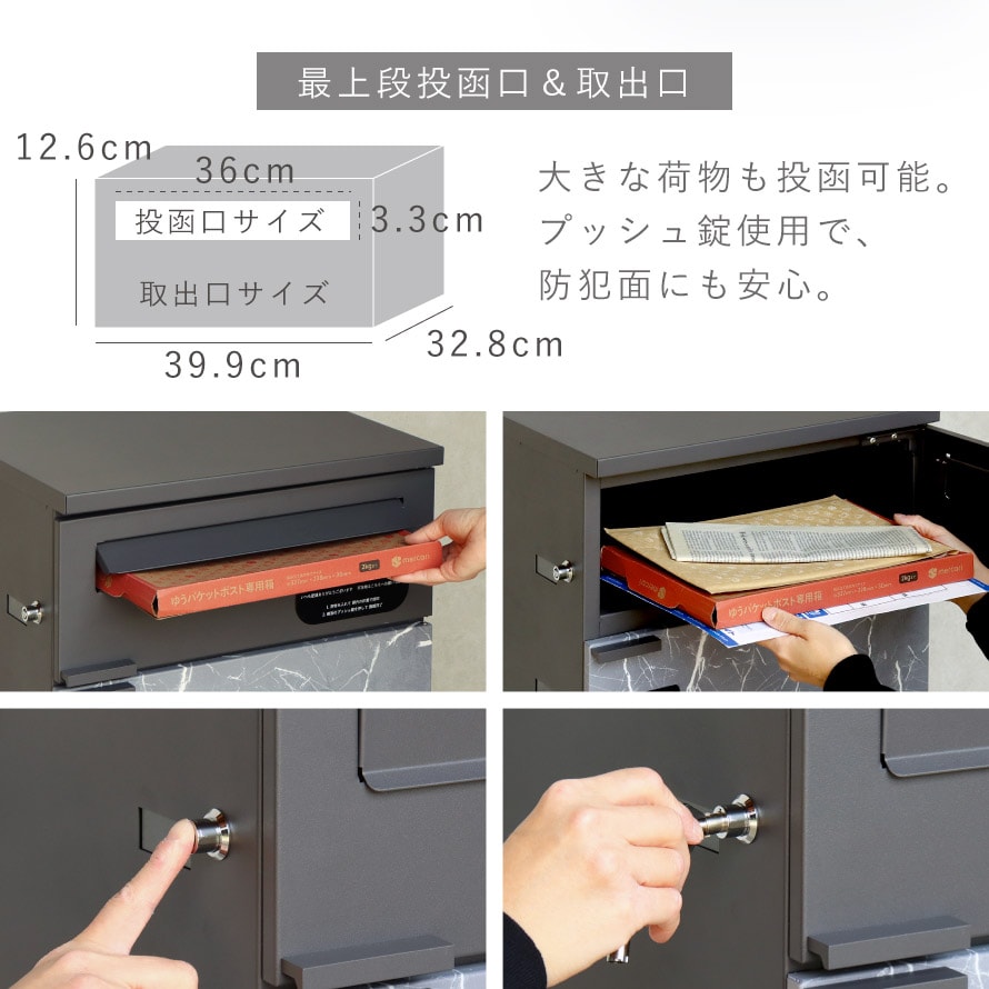 最上段収納の投函口サイズは幅36×高さ3.3cmと大きなサイズ設計で、ゆうパケットポストやネコポスなどの大きめの郵便物も投函可能です。