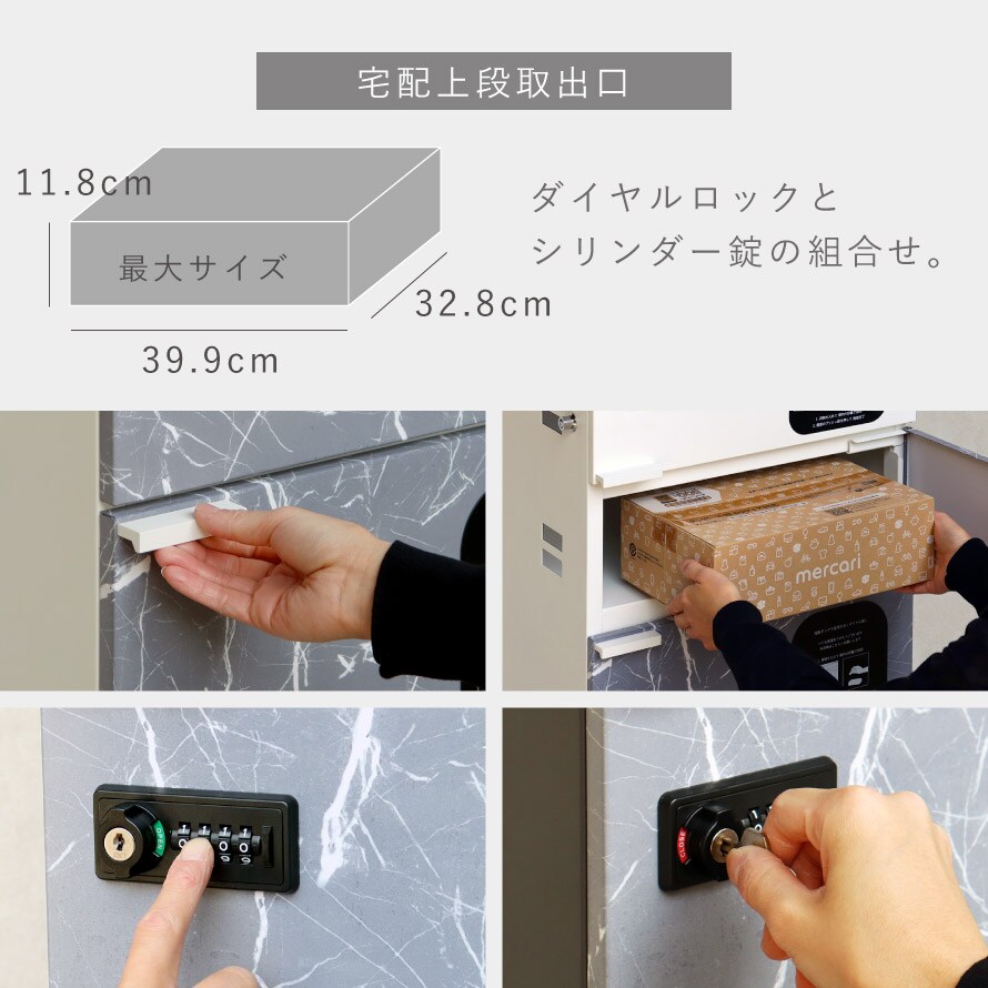 サイズ本体/幅44×奥行36.3(取手込みサイズ)×高さ85cm(アジャスター込みサイズ)、最上段投函口/幅36×高さ3.3cm、最上段取出口/幅39.9×奥行32.8×高さ12.6cm、宅配上段取出口/幅39.9×奥行32.8×高さ11.8cm、宅配下段取出口/幅39.9×奥行30.7×高さ36.5cm