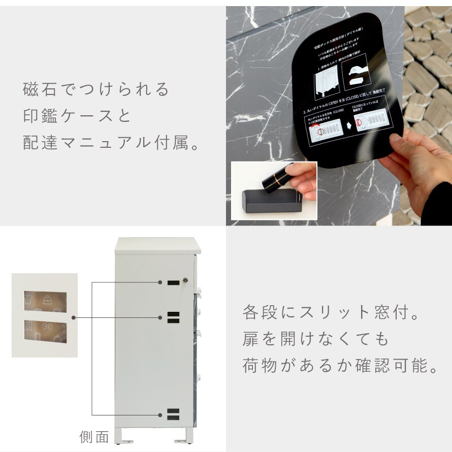 キー(3段とも付属)、印鑑ケースと宅配業者用のマニュアルが付属しており(マグネット付きでお好きな場所に貼り付け可)、宅配ボックスとして、すぐにご使用いただけます。