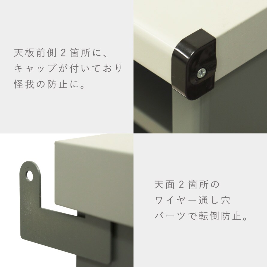 天面左右2箇所にはワイヤー通し穴パーツが、左右底面部にはアンカー固定用パーツが付属しており、転倒防止対策が施されています。