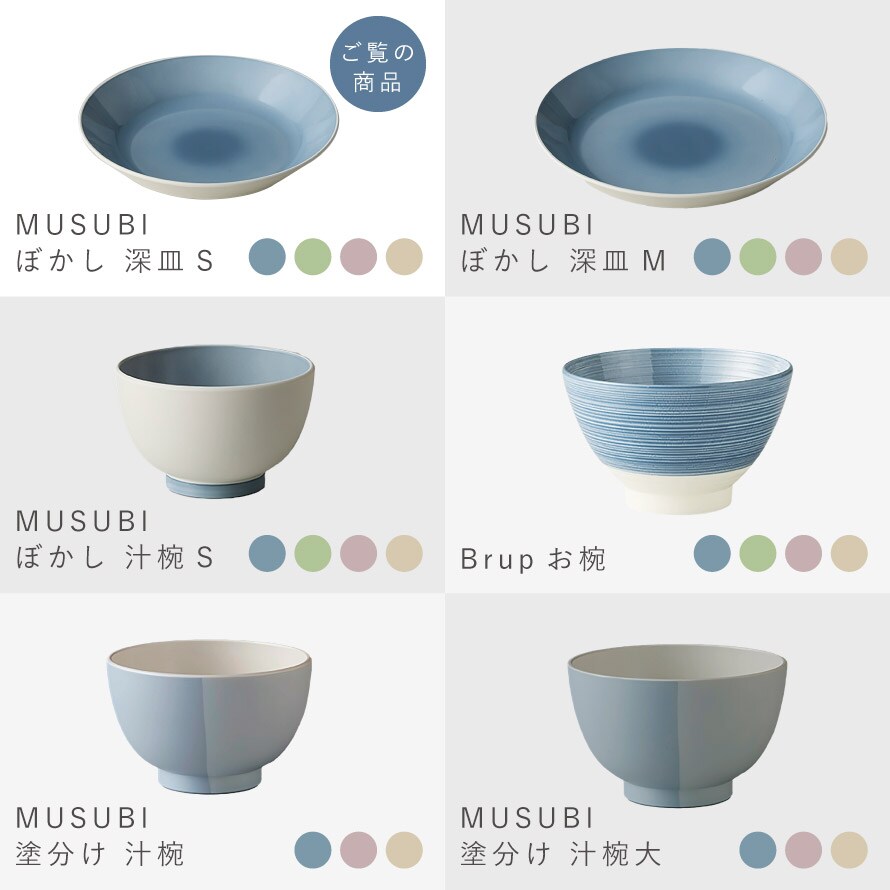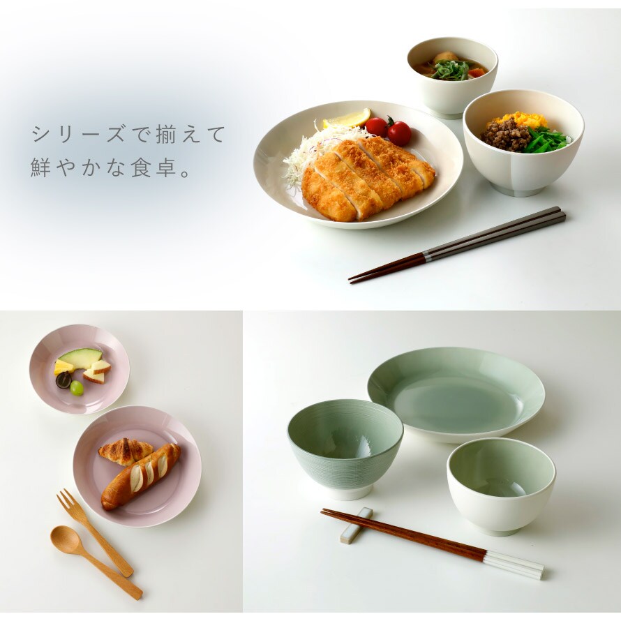 柔らかく淡い、にじむ塗りの色合いが料理を引き立て、和にも洋にも馴染みます。