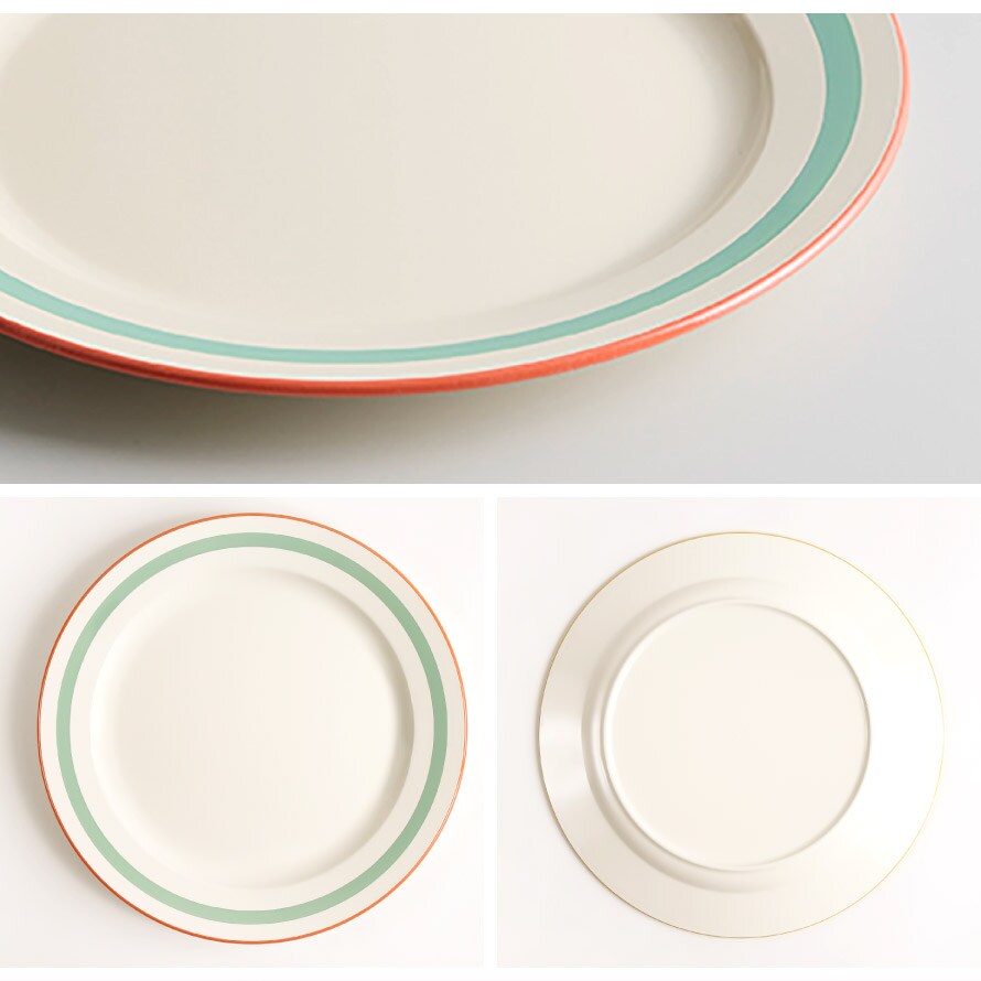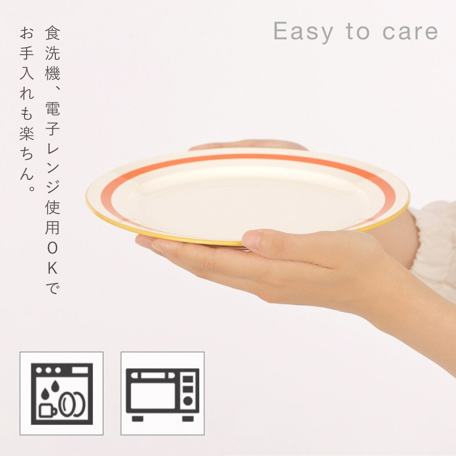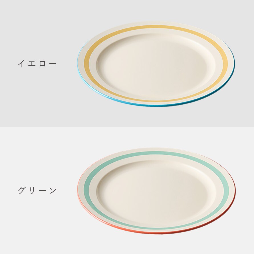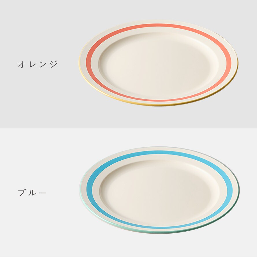 お皿の縁のラインがアクセント。少しレトロ感のあるデザインは食卓を楽しく彩ります。家庭用はもちろん、カフェ、アウトドア、お子様用に使っても。