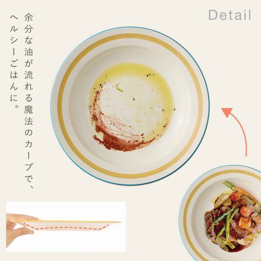 お皿の中央が盛り上がった形で、食材が液体に浸りにくい構造。ドレッシングや油が縁の方に流れ、カロリーや塩分の過剰摂取を防ぎます。