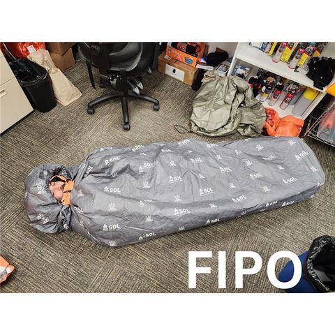 独自の透湿性素材を使い、内面は高純度なアルミ蒸着加工が施され体熱の 70 %を反射保持する、マミータイプの寝袋状につくられた画期的な製品。