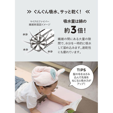 かぶるだけで髪の毛の水分をサッと吸水、ドライヤーの時間短縮に。