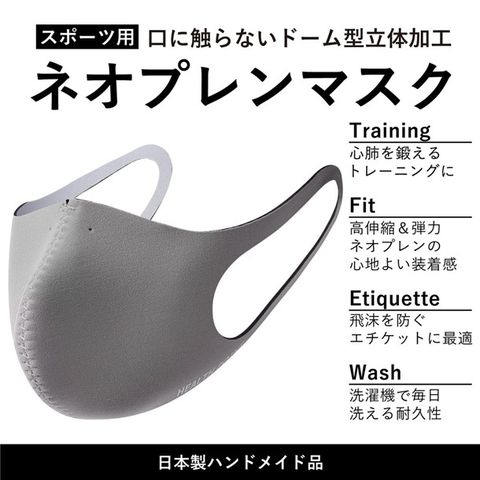 特長:フィット性(高伸縮・弾力・装着感)、飛沫防止、丸洗い可(中性洗剤・ネット使用)、保温性(ネオプレイン生地のため、冷感ではありません)