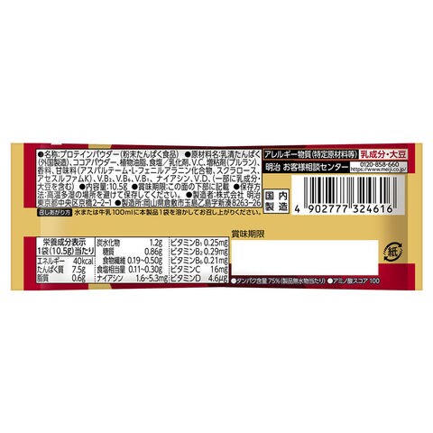 素材:乳清たんぱく(外国製造)、ココアパウダー、植物油脂、食塩/乳化剤、V.C、増粘剤(プルラン)、香料、甘味料(アスパルテーム・L-フェニルアラニン化合物、スクラロース、アセスルファムK)、V.B2、V.B6、V.B1、ナイアシン、V.D、(一部に乳成分・大豆を含む)