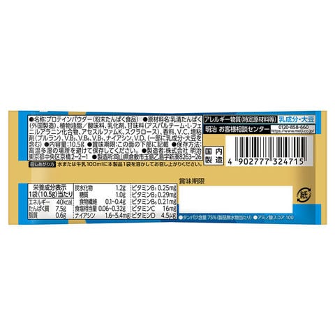 素材:乳清たんぱく(外国製造)、植物油脂/酸味料、乳化剤、甘味料(アスパルテーム・L-フェニルアラニン化合物、アセスルファムK、スクラロース)、香料、V.C、増粘剤(プルラン)、V.B2、V.B6、V.B1、ナイアシン、V.D、(一部に乳成分・大豆を含む)