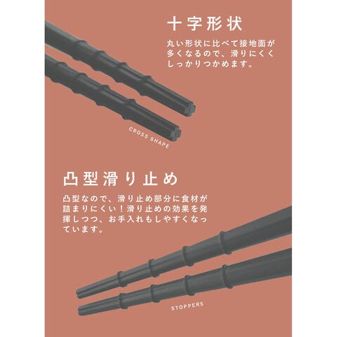 十字形状の箸先と凸型滑り止めで食材をしっかり掴めるので、盛り付けや調理、取り箸など、さまざまなシーンで活躍します。