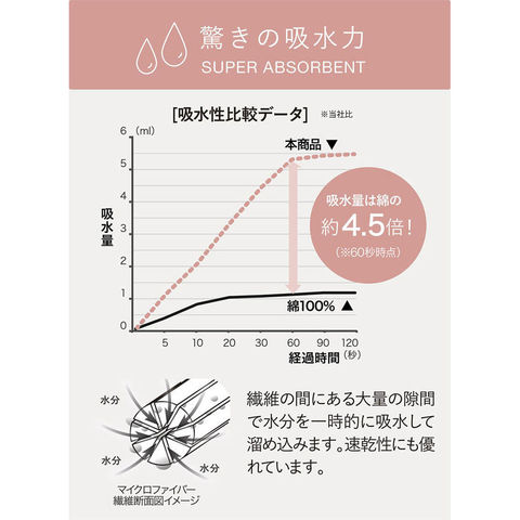 吸水力は綿の約4.5倍!タオルは通常のフェイスタオルよりも一回り大きいサイズでロングヘアーにも十分な大きさです。
