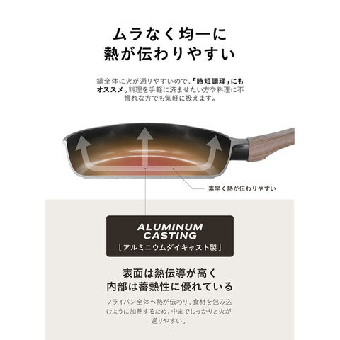 表面は熱伝導性が高く、内部は蓄熱性に優れているため、全体へ熱が伝わり、食材を包み込むように加熱し、中まで火が通りやすいです。