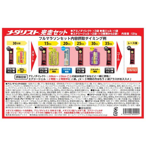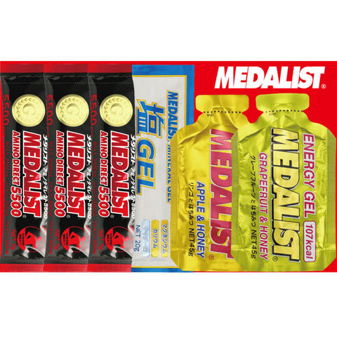 メダリストアミノダイレクト5500×3袋、塩ジェル×1袋、エナジージェル×2袋(リンゴ/グレフル/ブドウの内2種類)。