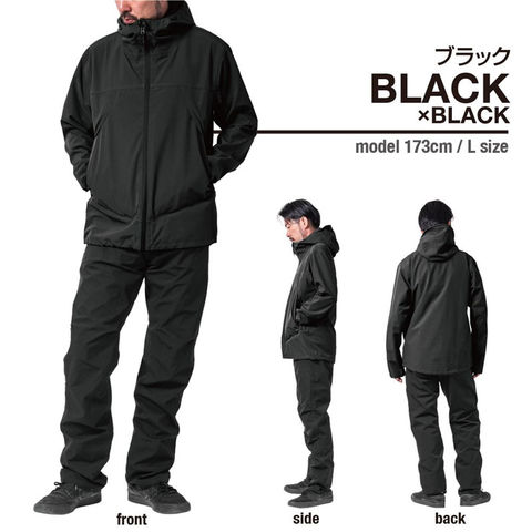 耐摩耗性に優れ、裏地もべとつきにくい合羽●生地は360度全方向ストレッチ●フードは使用しないときにスタンドカラーに収納可能●パンツは裾上がりやツッパリを軽減する立体裁断●裾口にはボタンで簡易に裾上げできる機能を搭載●右足後ろに視認性を高める反射プリントを搭載