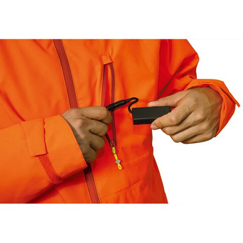 フード先端のスイッチを押すとライトが点灯し、両手をふさがずに照らせるレインジャケット。