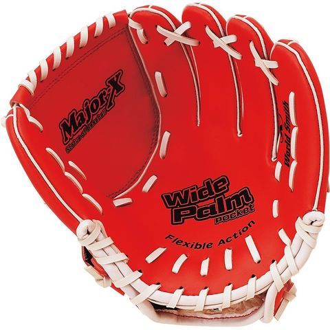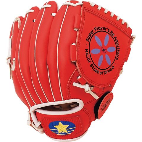 人気のレッドが個性をくすぐるキッズのためのグラブ 柔らかく手になじみやすい合成皮革グラブ 軽くて使いやすくキャッチボールにもオススメです。