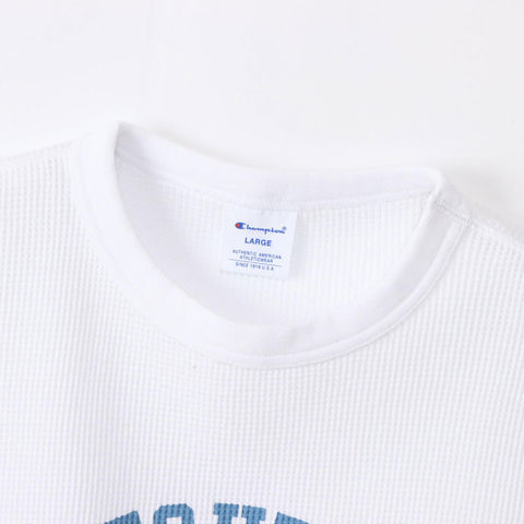 胸のプリントはChampion(R)(チャンピオン)ブランドと親和性の高いカレッジ風の書体をベースにしたもので、アーチ状、ストレート状の文字でカプセルナンバーを囲んだデザイン、アーチ状、ストレート状の文字を2段にレイアウトしたデザインの2タイプ(6種類)。