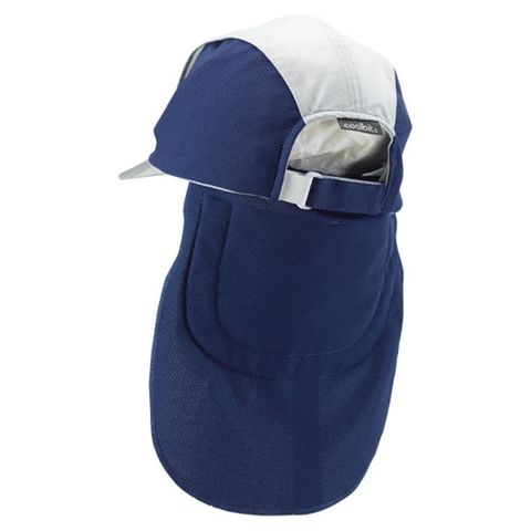 クールビットの日除けフラップは着脱自在なボタンを中心にして、帽子に反転して収納。