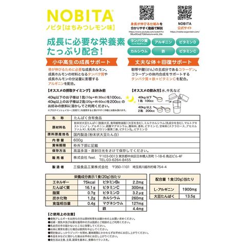 小中高生のお子様に!寝る前に、美味しく飲んで、お子様の成長ぐんぐんサポート!成長に必要な栄養素がたっぷり配合!NOBITAソイプロテインに含まれている栄養素。