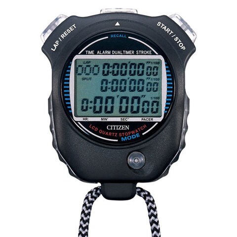 表示:デジタル1/100秒まで、9時間59分59秒まで計測、単純計時、積算計時、ラップ・スプリットタイム計時(99ラップ・各ラップのメモリー付)時計(12/24時間切替可)、カレンダー表示、アラーム機能、カウントダウンタイマー機能、ベースカウント機能(設定した秒数の間隔で電子音が鳴ります)