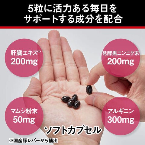 国産豚レバーから抽出した肝臓エキスをはじめ、毎日の健康をサポートする発酵黒にんにく粉末、マムシ粉末、アルギニンを配合しました。