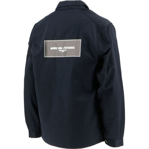 右胸にサッカーボールをイメージした六角形のシリコン素材のワッペンを、左胸と袖に、GRANDE.F.Pメッセージ入りのフェイクスウェードワッペンがそれぞれ施され、背中にはフットボールの子供たちへ、の意味の、“NINO DEL FUTBOLのボックスロゴがラバー加工された、シンプルかつ、粋なデザインがポイントな、ニューアパレルラインジャケットの新作。