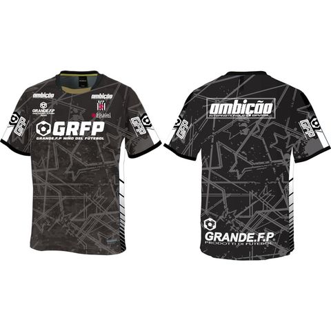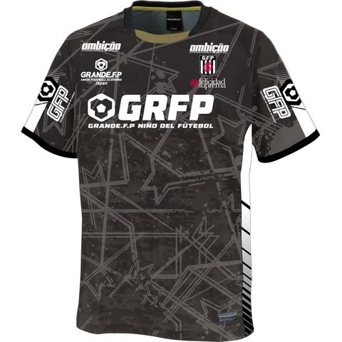 GRANDE.F.P定番の.吸汗速乾性に優れたドライメッシュ素材を使用し、パスサッカーを幾何学的にイメージした柄と、様々なロゴプリントでデザインされたインパクトを与えること間違いなしのプラクティスシャツ。