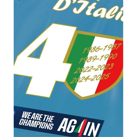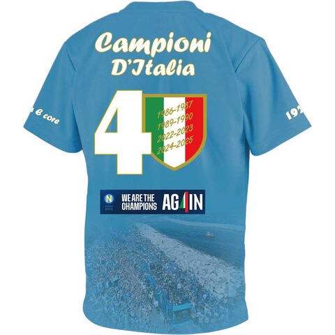 セリエA.2024-2025シーズンを今季最終戦ホームにて、2シーズンぶり4度目のスクデッドを獲得した、チャンピオンTシャツが先行予約販売開始!!チームカラーのスカイブルーをベースに、過去優勝年度と、今期優勝パレ―ドの画像をモチーフにしたデザイン。