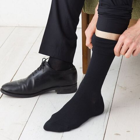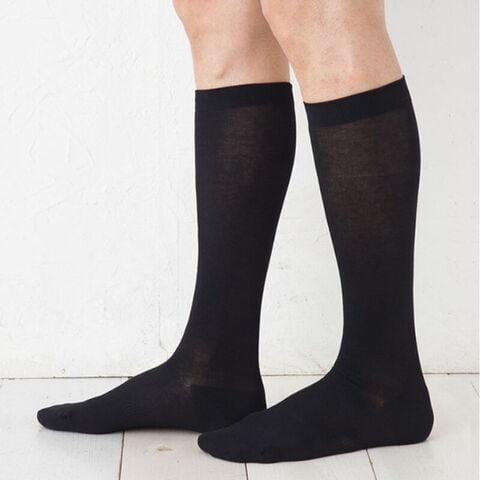 着圧ハイソックス、ポリエステルの特性を活かし、通気性・吸水速乾性を実現させながら綿のようなソフトな風合いをもった特殊繊維を採用しています。