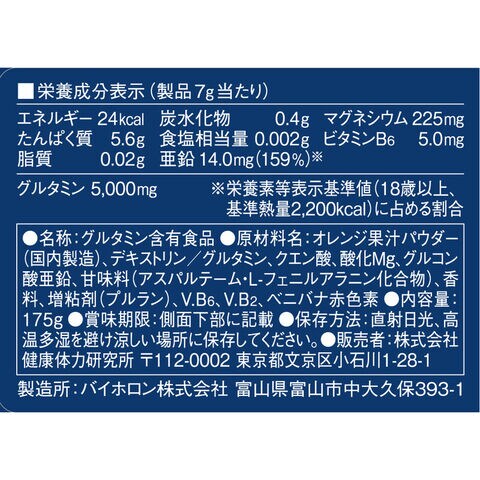素材:オレンジ果汁パウダー(国内製造)、デキストリン/グルタミン、クエン酸、酸化Mg、グルコン酸亜鉛、甘味料(アスパルテーム・L-フェニルアラニン化合物)、香料、増粘剤(プルラン)、V.B6、V.B2、ベニバナ赤色素