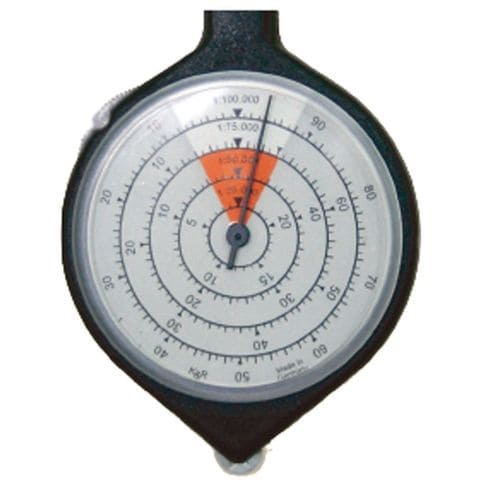 メーターカウンターは1目盛1cm、3mまでの連続測定が可能、裏面のロードマップメジャーは1/25,000、1/50,000、1/75,000、1/100,000の地図に対応します。