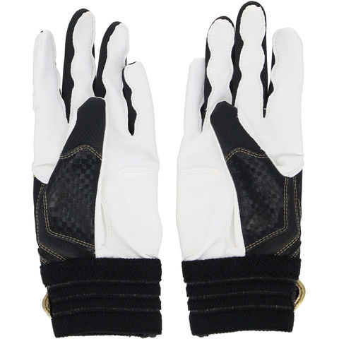 甲には意匠性に優れたデザイン、平にはグリップ性に優れた合成皮革を採用、メッシュ構造の手首ベルト、TOPモデルともデザイン連動したジュニア用バッティング手袋。