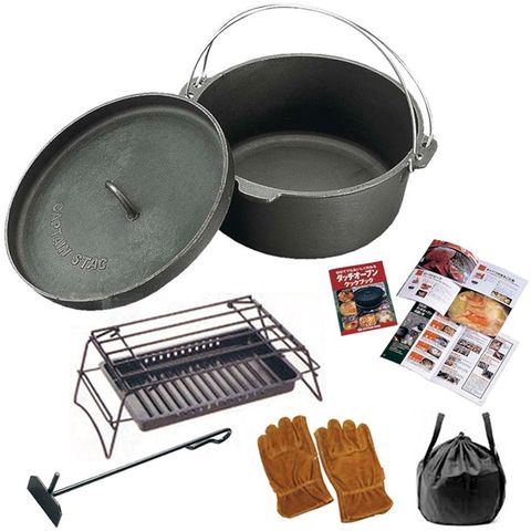 ●セット内容/ダッチオーブン30cm 、リッドリフター 、ダッチオーブン用収納バッグ 、スリーウェイダッチオーブンスタンド 、アウトドアレザーグローブ 、ダッチオーブンクックブック(A5版36ページカラー4色印刷)