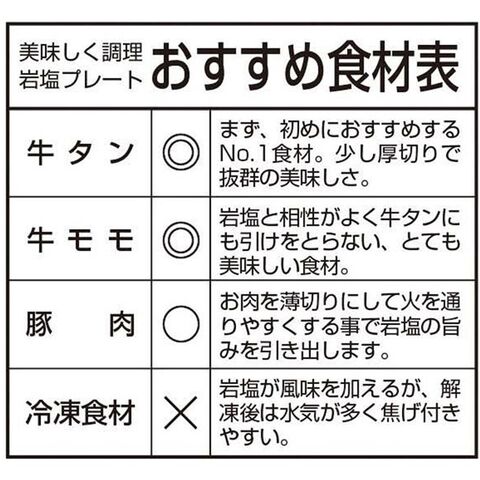 ※水気の多い食材は、岩塩が溶け出し焦げ付きやすくなります。焦げ付いた場合はプレートを裏返してお使いください。両面が焦げ付いた場合は、ナイフ等で焦げをやわらかく削り取ってから再度お使いください。指や手等を切らないように十分ご注意ください。