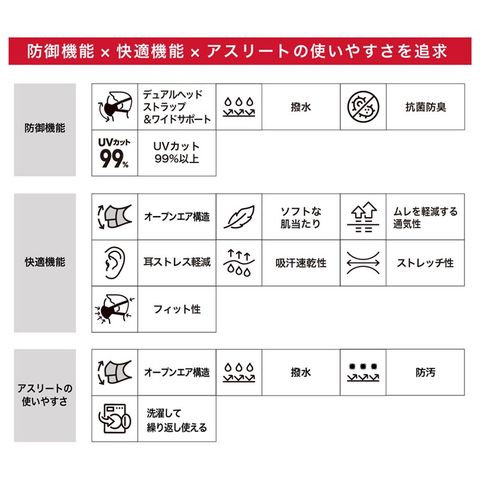 【快適機能 COMFORT】オープンエア構造 ・耳ストレス軽減 ・ソフトな肌あたり ・ムレを軽減する通気性 ・吸汗速乾性 ・ストレッチ性 ・フィット性