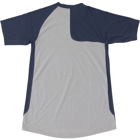 利き腕側の右胸と肩甲骨周りと両上腕部に高着圧のタイトなストレッチ素材、メインボディは心地よくフィットする素材を採用した右投げ用アシンメトリーショートスリーブトップ。