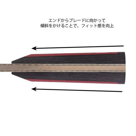 エンドからブレードに向かって傾斜をかけて先細りにすることで、厚みが感じづらく握りやすい形状に調整しました。